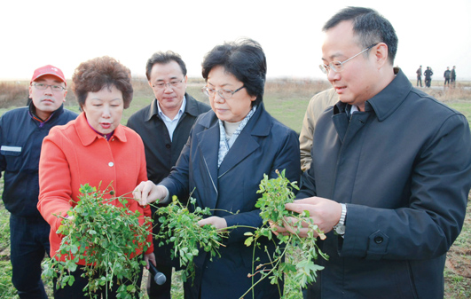 3日下午,李斌一行首先來(lái)到位于五河縣朱頂鎮(zhèn)的全國(guó)最大的紫花苜蓿生產(chǎn)基地——秋實(shí)草業(yè)有限公司調(diào)研。在市委書(shū)記周春雨、代市長(zhǎng)白金明的陪同下,李斌深入田間察看牧草長(zhǎng)勢(shì),當(dāng)她得知牧草品質(zhì)上乘,草場(chǎng)機(jī)械化作業(yè)達(dá)到世界先進(jìn)水平時(shí),不住地點(diǎn)頭稱(chēng)贊。調(diào)研中,李斌和在這里打工的女拖拉機(jī)手、朱頂鎮(zhèn)小柳村村民劉小紅拉起家常,希望她通過(guò)自己的努力過(guò)上更加幸福美好的生活。